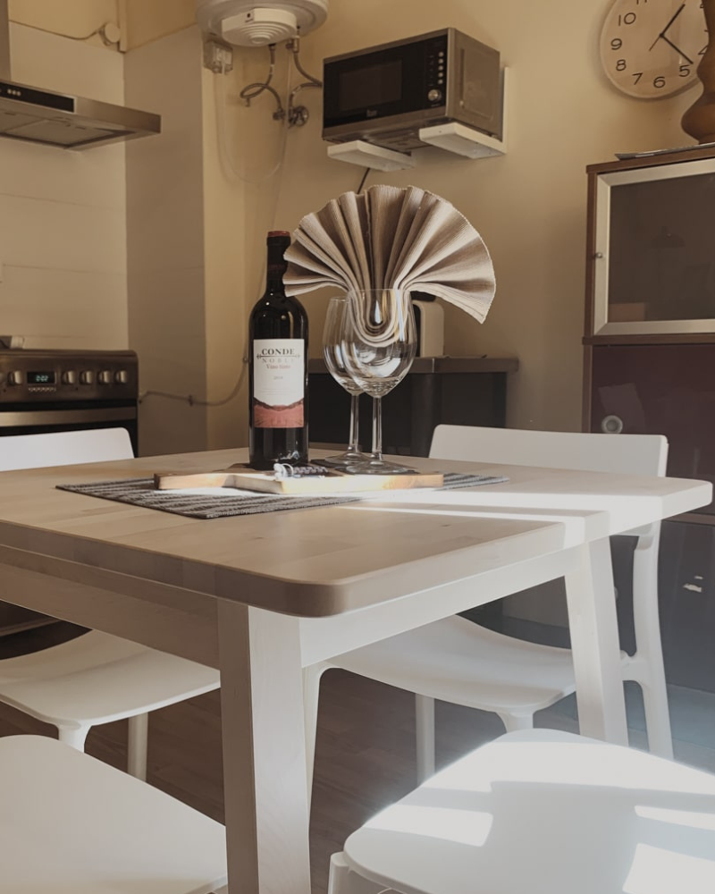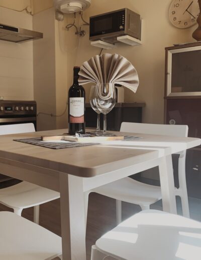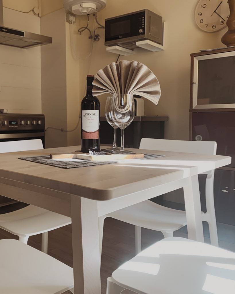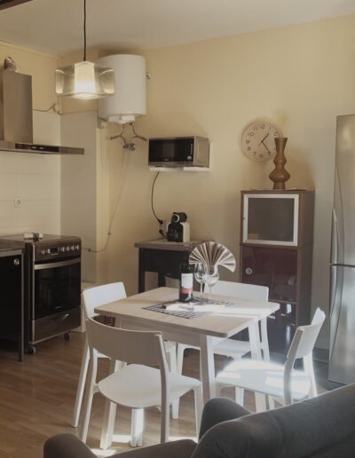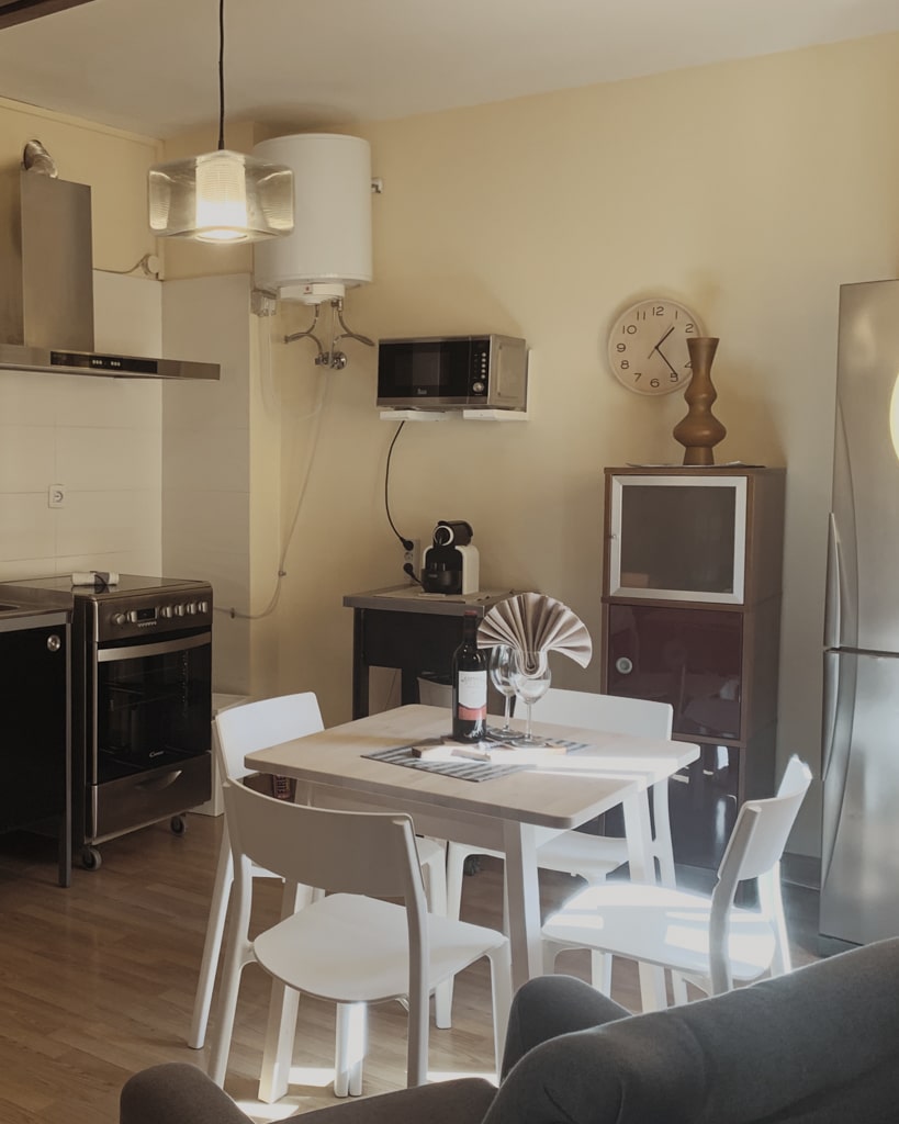 Dispone de una amplia cocina y comedor, equipada con un horno, un microondas, una tetera, una cafetera y una nevera. La mesa esta adecuada para 4 personas.